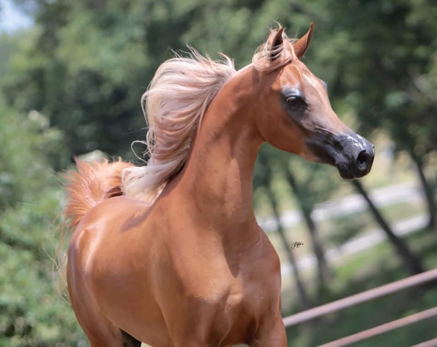 The daughter of the etheral pure white beauty, Alia Psyche IA. Aleemah is the absolute bedouin « mare in the tent ». Soft gigantic eyes, pointy lovely ears, long arched neck, dense and long mane and forelock, 15h1, full of substance, strong hip with correct legs and feet. Beautiful and feminine expressive movement, Aleemah is a vision. She had an unbelievable filly in 2021, Estonia De Jure MA. She is a foundation mare for us at Arabel.